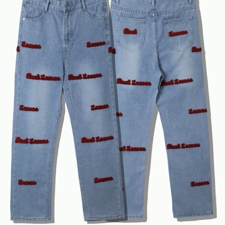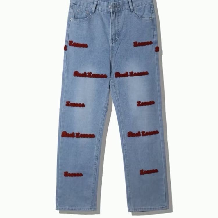 High street red embroidered design jeans, retro straight loose wide-leg pants